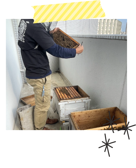 養蜂活動は、パレットくもじのビルの空きスペースを活用し行っております。養蜂のシーズンは春(3月〜6月)秋(9月〜12月)の年2回です。 ※ハチミツの収穫量が少なく、開発中のため市場での販売は行っておりません。